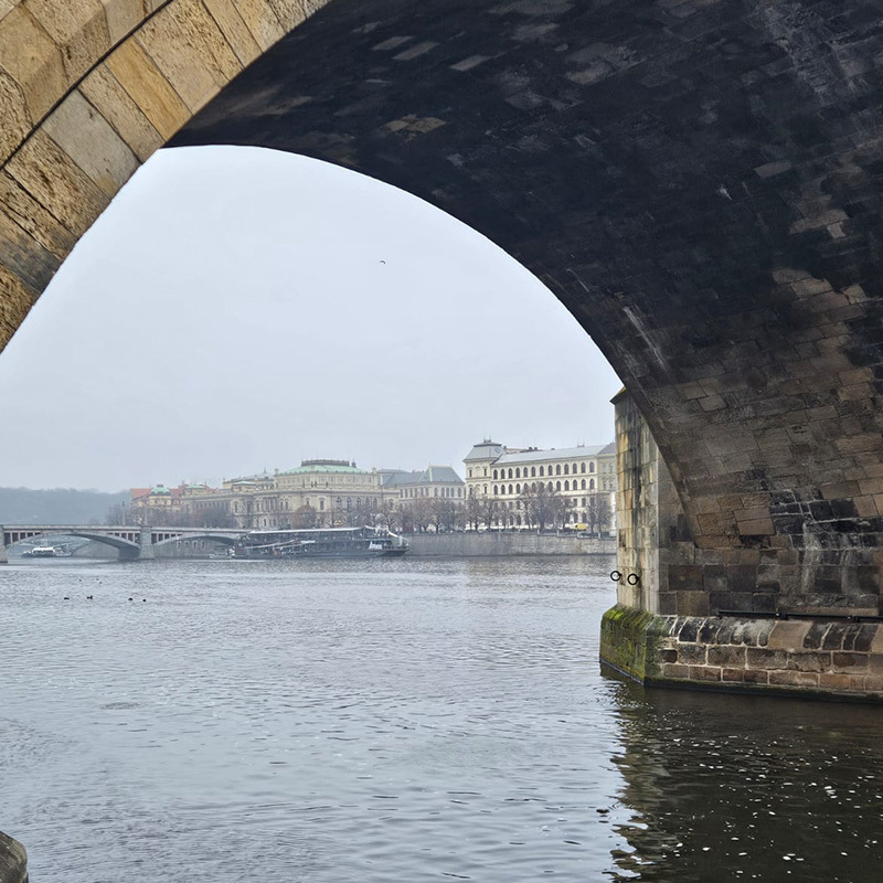 Zážitek začal už cestou pod most. Kličkování malými uličkami, mezi lidmi, trhy a domy mě na okamžik přeneslo do akčního filmu. S tím rozdílem, že moje obavy se točily spíše kolem pokut za jízdu po pěší zóně než zločinců, které bych mohla mít v patách. Šťastně jsme dorazili pod Karlův most. Poryvy ledového větru mi vehnaly slzy do očí. Došlo mi, jak moc jsem si odvykla na naše chladné počasí. Zlatých 8 stupňů v Bratislavě!